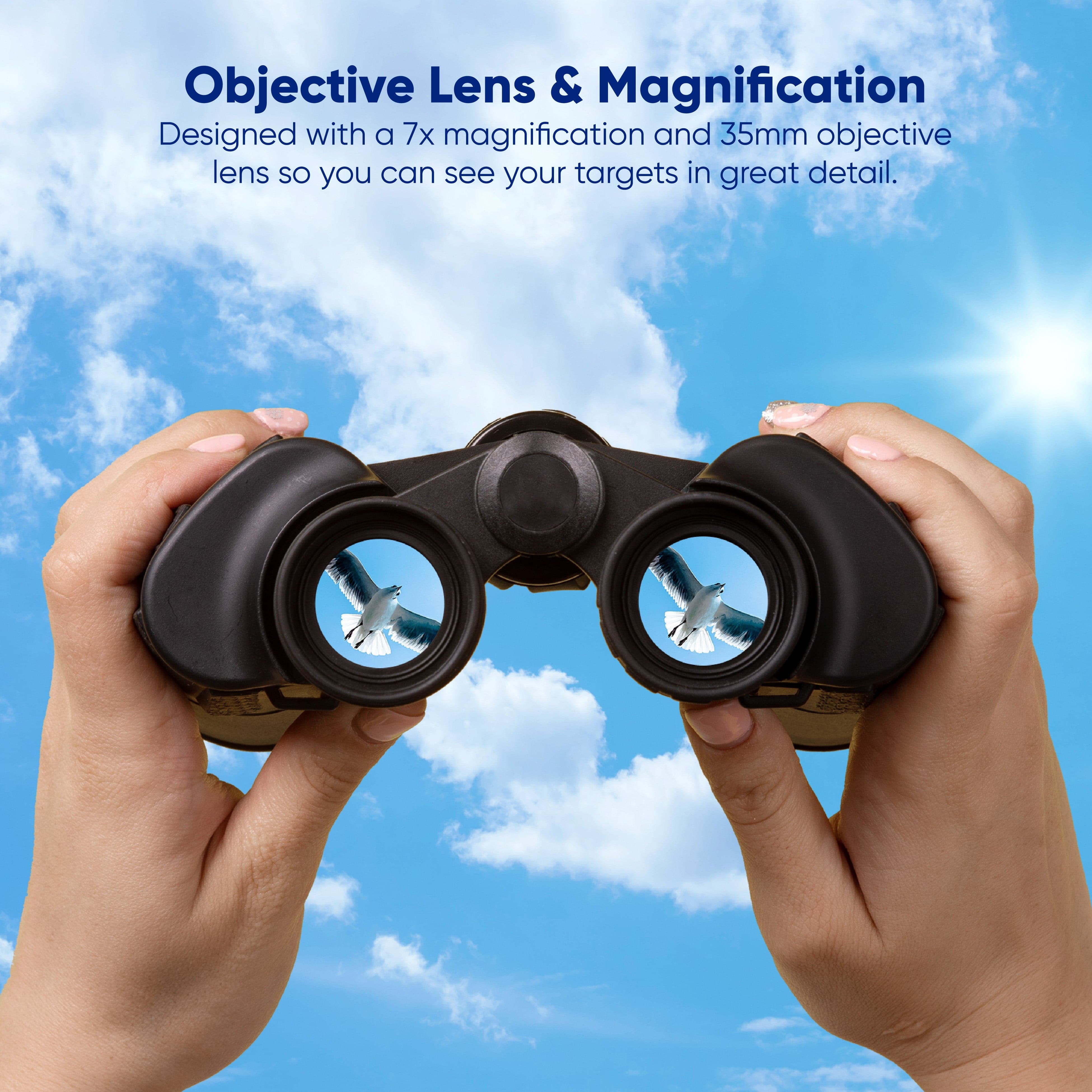 Fully loaded with features essential for days out in the field, the PRAKTICA Falcon 7x35mm Wide Angle Porro Prism Field Binoculars offer solid, multipurpose optics at an economical price. Multi Coated Optics deliver bright, sharp, crisp details with impressive resolution even in low light conditions for better light gathering capability. Ideal for birdwatching, hiking, nature watching and sporting events. Great for everyday use, and a perfect gift for family and friends. The binoculars have an Aluminium Chassis for strength and rigidity and a Rubber Armour outer covering for protection. The large, smooth focus wheel, allows users to quickly focus on their subject at varying distances, even with gloves on.