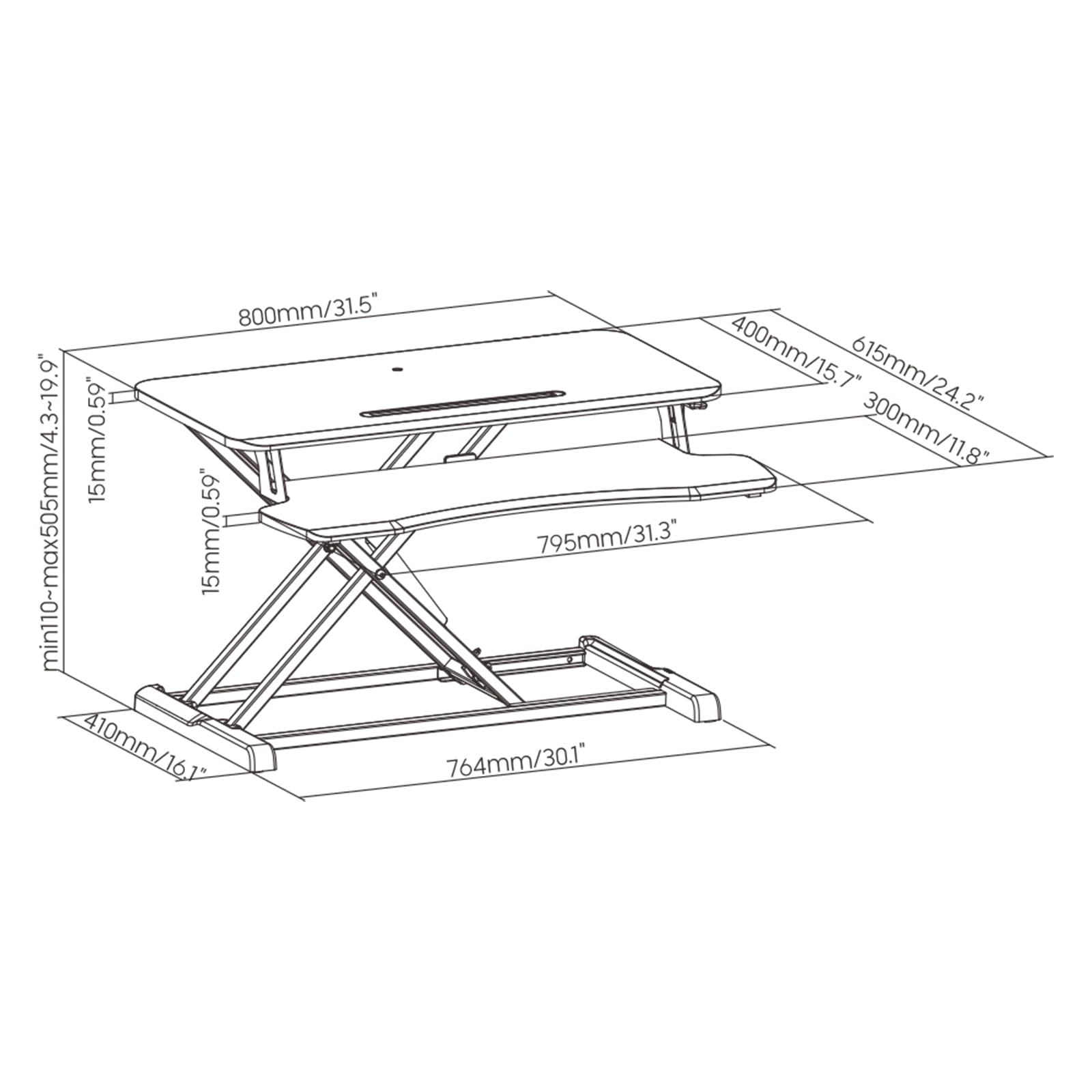 The ProperAV Two Tier Worktop Stand Up Desk Converter with Gas Spring Lift & Variable Height Settings is made of eco-friendly particleboard and features step-less height adjustment with the assistance of a gas spring strut. The non-skid silicone pads protect your work surface from scratches or scuffs. There's also plenty of room for your keyboard and mouse, thanks to the keyboard tray which was designed specifically to protect your elbows.
