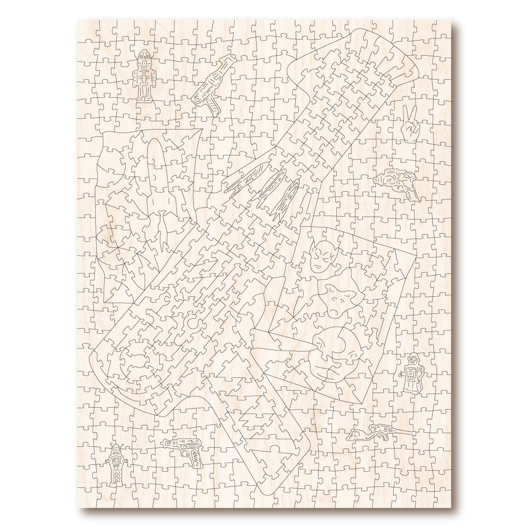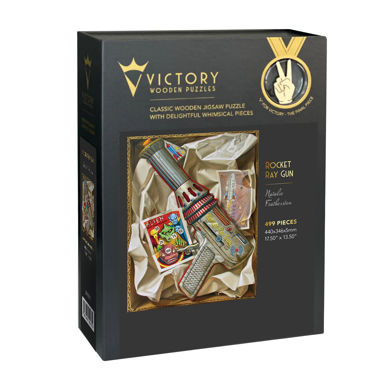 This cool puzzle brings out the 14 year old boy in all of us - the ray gun is actually a puzzle within a puzzle and features some great whimsical pieces - it's great fun to put together!! (see 2nd image which shows the puzzle back)