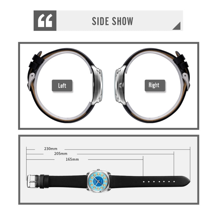 1. Net weight: 36g2. Movement type: quartz movement3. Mirror material: glass4. Case material: stainless steel5. Strap material: leather6. Buckle material:... Read more