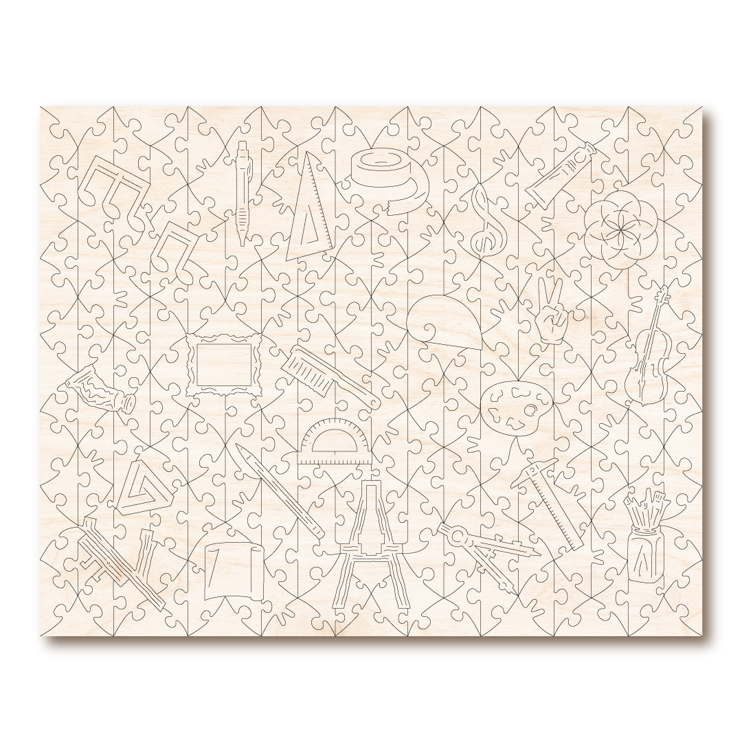 This vibrant 250 piece wooden jigsaw puzzle contains over 20 whimsy pieces, including drafting instruments, artists materials and musical themed shapes.