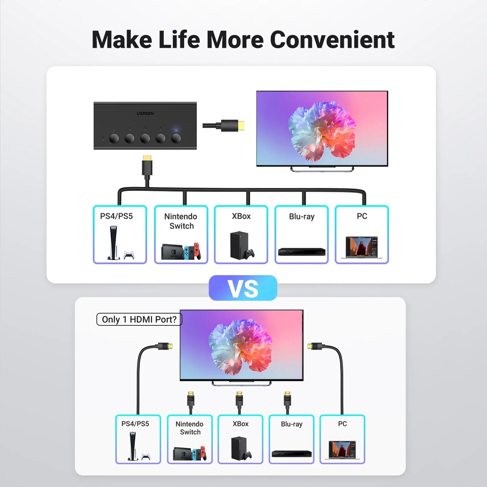UGREEN HDMI Switch 5 in 1 Out 4K@60Hz, HDMI Splitter with Remote 5 Port HDMI Switcher Selector Support 3D CEC HDR HDCP2.2 PS5/4