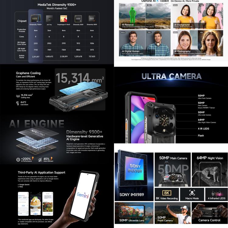 Specifications1. CPU: MediaTek Dimensity 9300+, 4nm, octa-core, 1x Arm Cortex-X4 up to 3.4GHz, 3x Arm Cortex-X4 up...