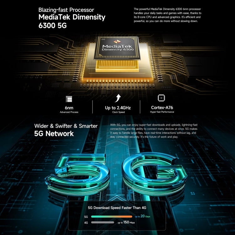 Specifications1. CPU: MediaTek Dimensity 6300, octa-core, 2.4GHz, 2 x Arm Cortex-A76, 6 x Arm Cortex-A55