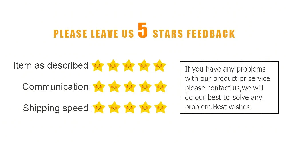 1) Dear buyers, your satisfaction and Positive feedback is very important to our business development. Please leave rate the details of transaction (Detailed Seller Ratings) on aliexpress with a "PERFECT 5 STARS".