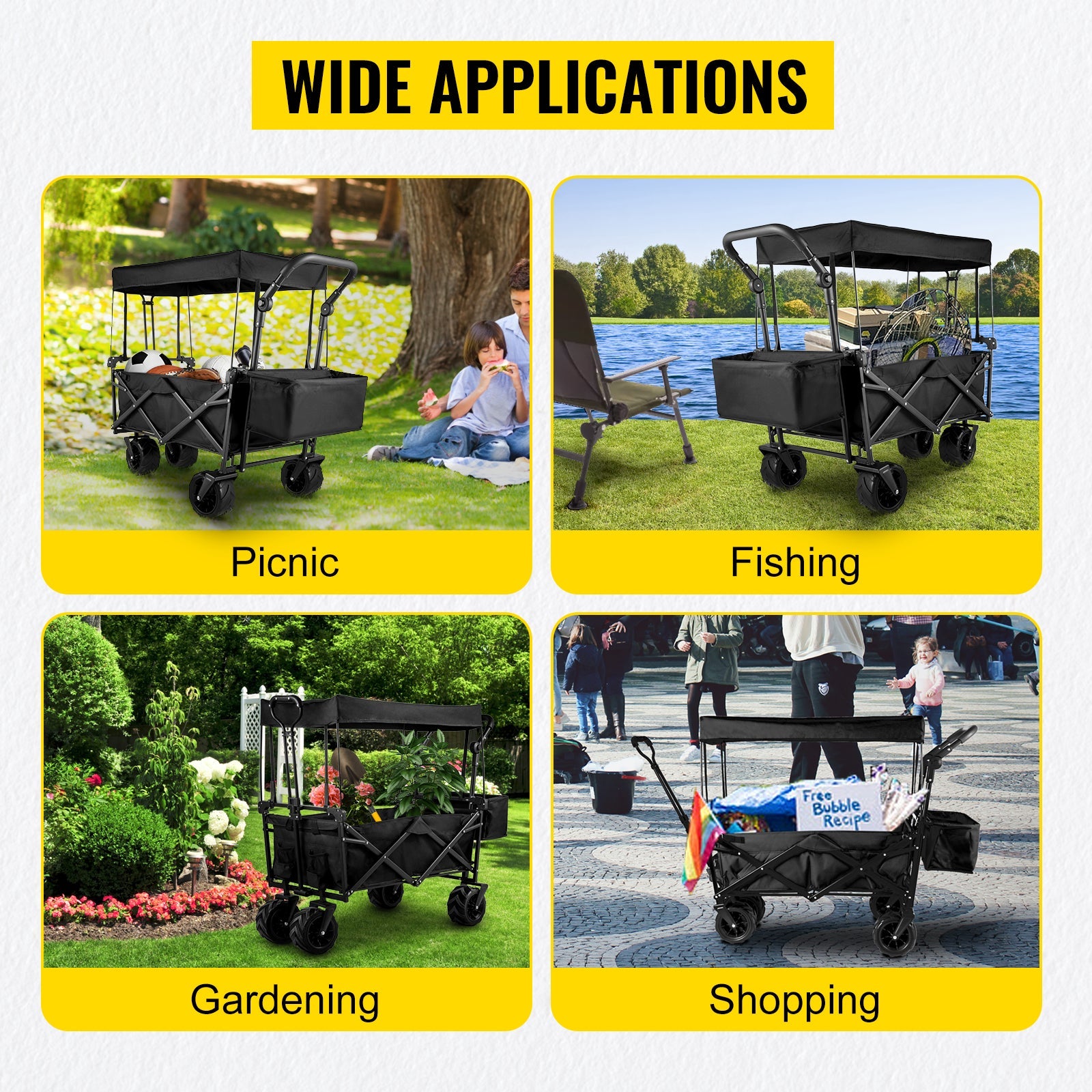 If you are looking for a folding collapsible wagon, VEVOR will be your great choice. Our folding wagon features a high-strength powder-coated steel frame. The large storage space and 220 lbs load capacity ensure that you can take all your belongings to a picnic. Wherever you go, the foldable design keeps you from worrying about storage