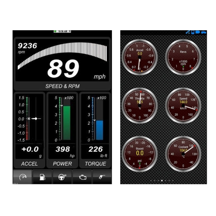 3. Display real-time operating performance of the car, such as momentum, vehicle speed, oil pressure, coolant temperature, engine load, intake manifold pressure, throttle position, the values of oxygen sensors, air intake temperature, and more.