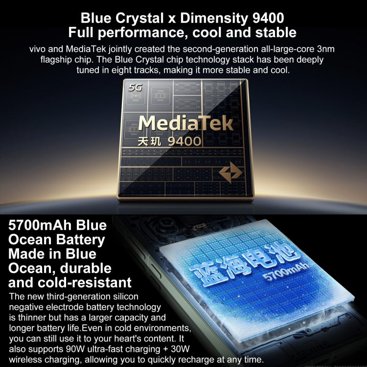 Specifications1. CPU: Dimensity 9400, 64-bit, octa-core, 3nm, 3.626GHz x 1 + 3.3GHz x 3 + 2.4GHz x 4