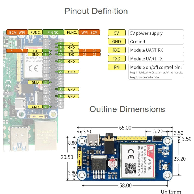 FeaturesThe A7670E Cat-1 HAT is an LTE Cat-1 module, which supports wireless communication modes including LTE-TDD, LTE-FDD, GSM, GPRS and EDGE, with up to 10Mbps downlink rate and 5Mbps uplink rate. It supports Windows/Linux operating systems and multiple network protocols. The module size is the same as SIM7000/SIM7070 series, and the AT commands is mostly compatible with SIM7600 series. It is suitable for IoT applications like remote information processing, monitoring devices, POS, industrial routers, remote diagnosis, and so on.