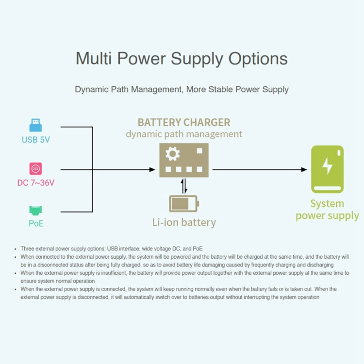 - When the external power supply is insufficient, the battery will provide power output together with the external power supply at the same time to ensure system normal operation