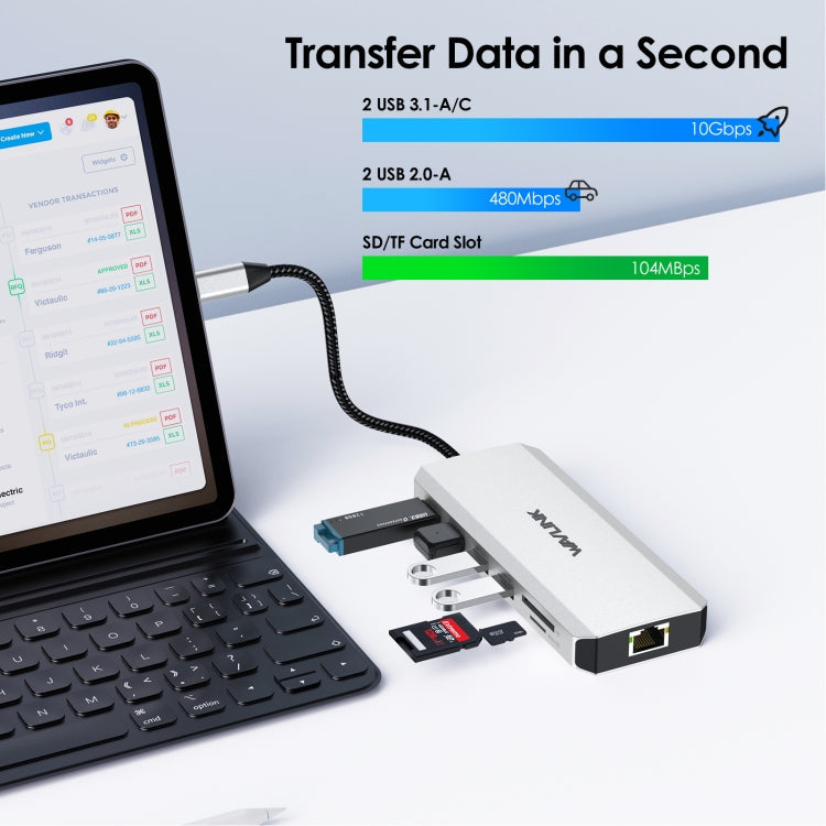 4. High-speed Data Transmission: Dual USB 3.1 (backward compatible with USB 3.0/2.0) ports ensure a data transfer rate of 10Gbps, and provide more connection possibilities at the same time with dual USB 2.0 ports. SD/TF card slots can work at the same time, supporting transfer speeds up to 104MB/s, which is very suitable for users of cameras, monitors, etc. RJ45 port supports up to 2500Mbps and stable network