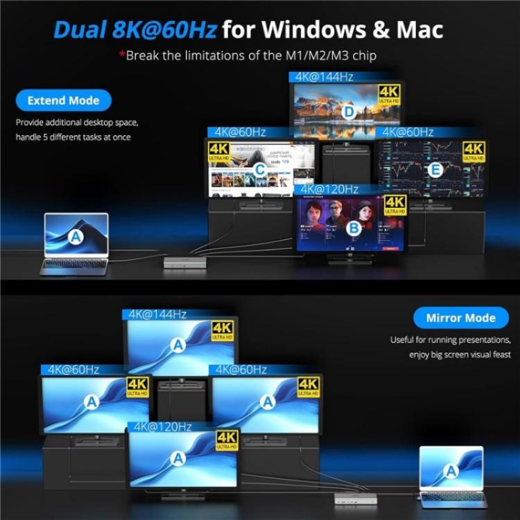 1. Quad Display Support: Utilizes the latest DisplayLink DL7400 chipset to bypass for Apple triple display limit, supporting up to four 4K 60Hz displays or dual 8K 60Hz displays.
