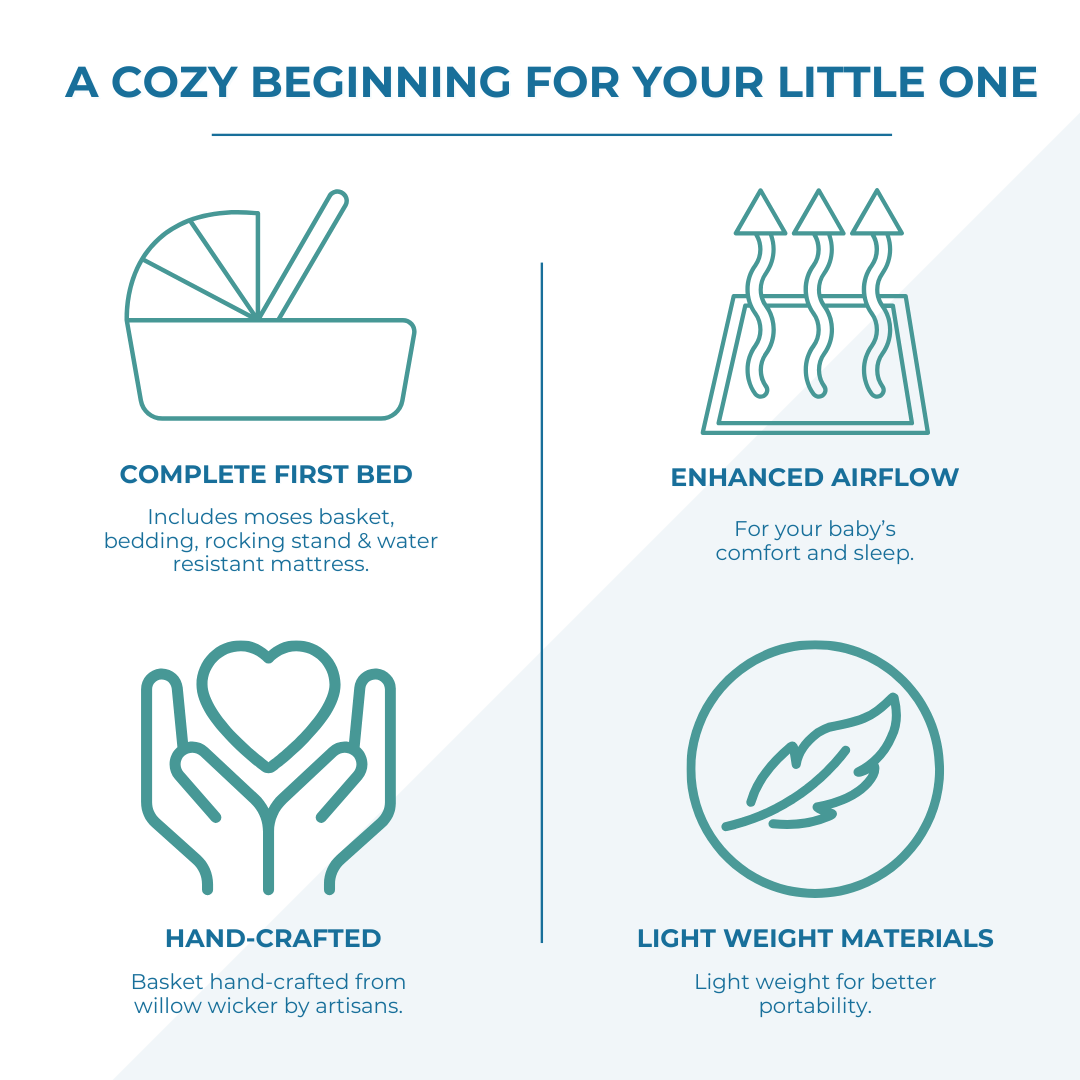 Safety is our utmost priority. Each hand-woven basket exceeds the latest EU safety standards, giving parents peace of mind. The slumber experience is enhanced with extra padding, a protective hood, and an elegant quilt, providing warmth and security for your baby.