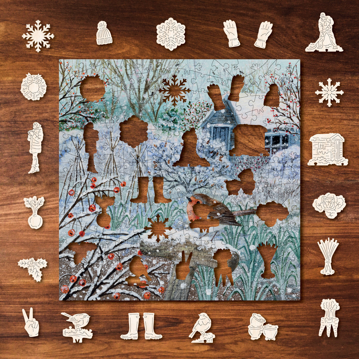 Experience the magic of winter with Winter Garden Robin, a stunning wooden jigsaw puzzle. With 238 irregular and whimsical shaped pieces, this puzzle captures the beauty of a winter garden, complete with snow-covered red berries, trees, and a charming robin. Get lost in the intricate details as you piece together this delightful winter scene. Perfect for puzzle enthusiasts and nature lovers alike.