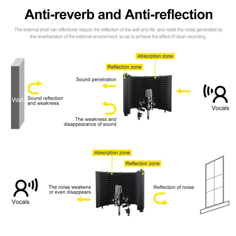 1. Eliminate Interference: The inner side of the microphone isolation shield is made of absorbing cotton insulation that can reduce sound reflection when recording.